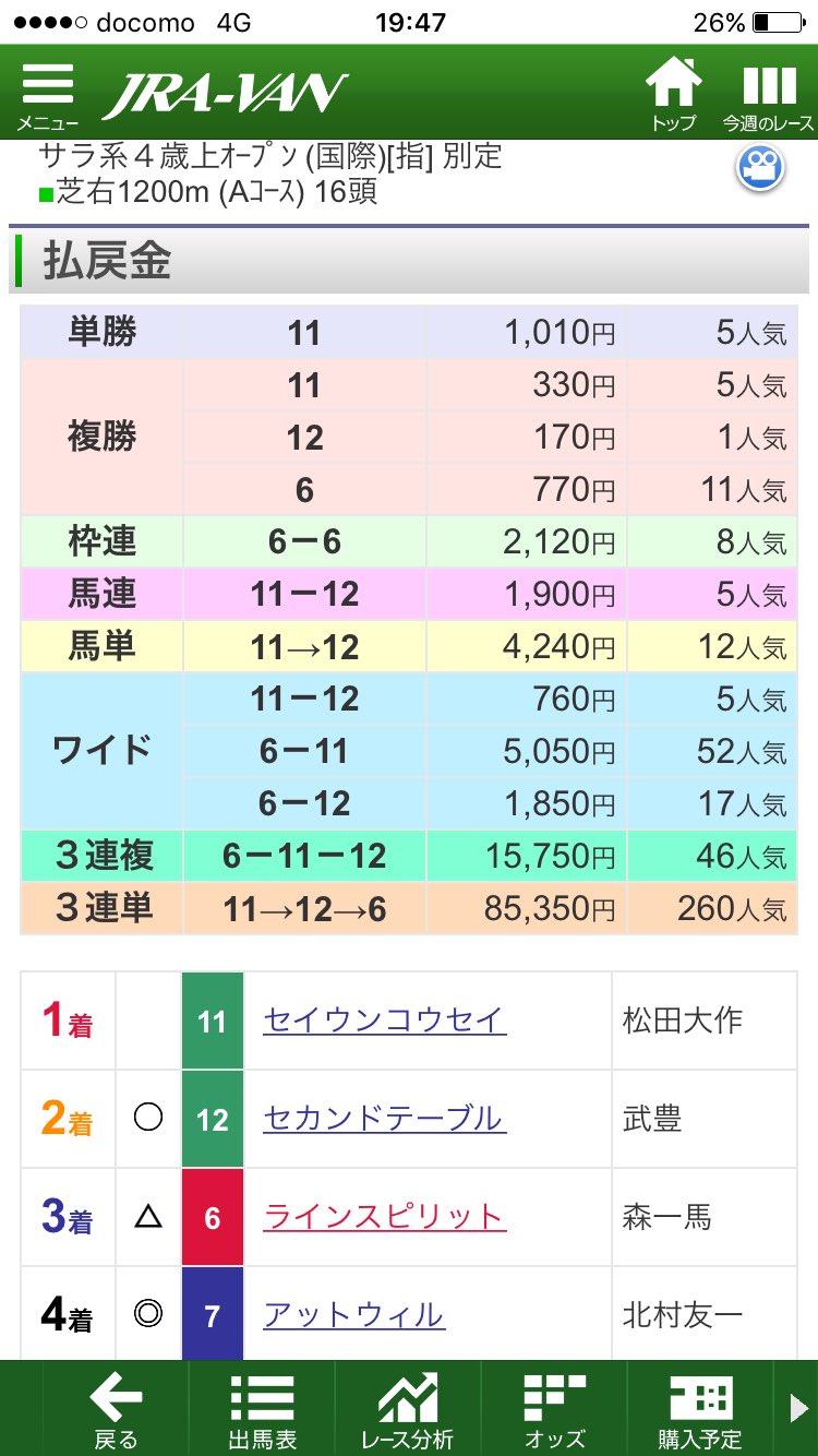 @ltayanylアットウィル4着〜( ˙-˙ )結構自信あったのに。もう歳かな?笑セイウンコウセイがこんな競馬できると思ってなかった。タフな競馬も出来るし軽い馬場もいける。って強いな。
