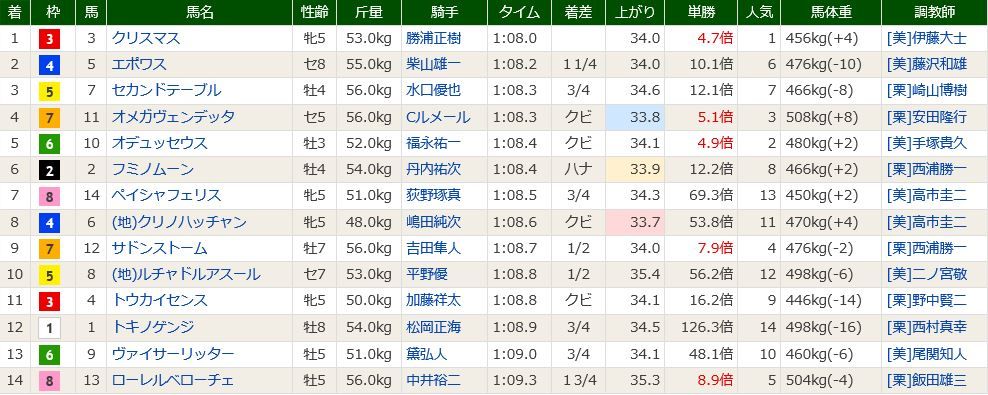 好位3番手を進んだ1番人気クリスマス(牝5、伊藤大)が残り100メートルで抜け出し、2着に1馬身1/4差をつけ押し切った。勝ちタイムは1分8秒0。